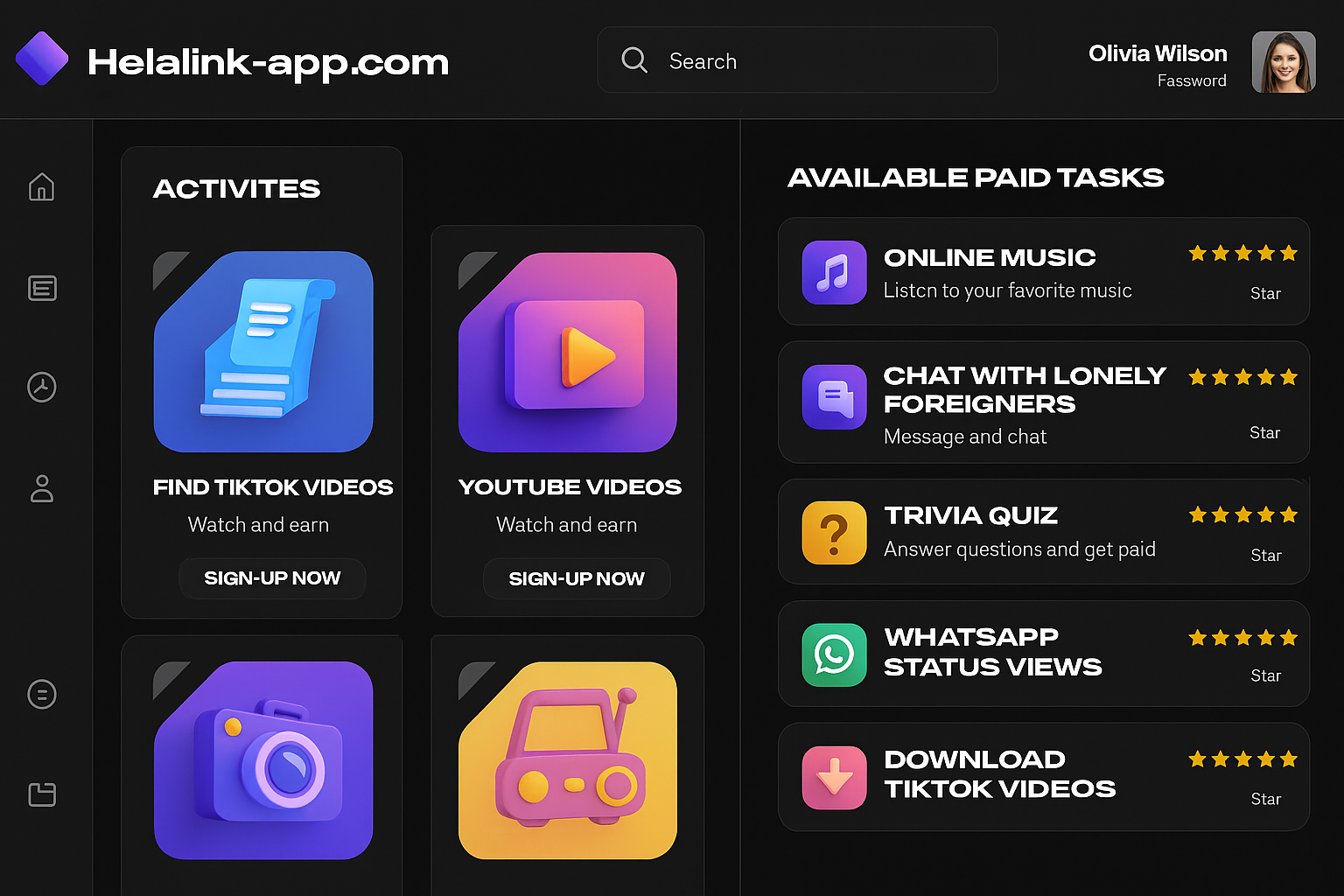 Helalink App is a digital earning platform that allows users to make money by completing tasks like watching sponsored TikTok and YouTube Videos, Answering Trivia Questions and Surveys , Clicking Paid Ads,WhatsApp Status Views for products for sale, Streaming Music& Netflix Movies, Play Online Games, Chatting with Lonely People, Streaming via WhatsApp Links, Uploading Content for Foreign Users, Introvert Ghostwriting Tasks, Listening to Background Music, Sharing Informative Video Ads and Downloading Content Without Watermark. It offers a simple way to earn income using just a smartphone and internet connection as long as you have an active Account.